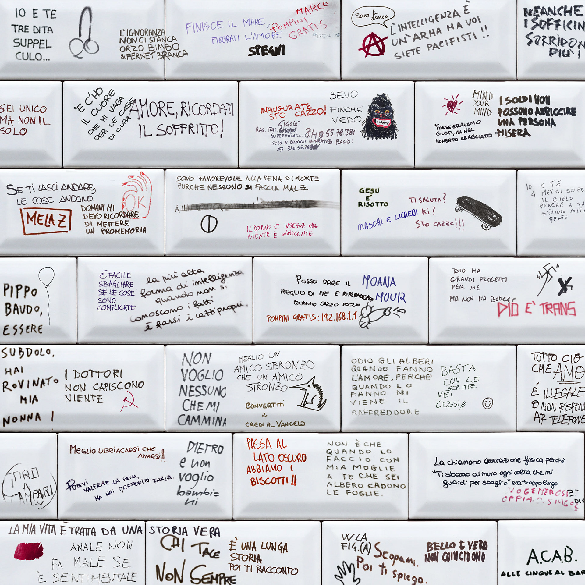 Le piastrelle del bagno sono compilate di scritte, la tipica arte rupestre dei gabinetti negli autogrill. Il tratto è verosimile ma non vero, l’interior designer deve aver scelto quella fantasia per contrastare lo stile asettico dei sanitari, ma tra tutte le finte scritte una è vera: si percepisce l’Uni POSCA; da piccolo eri assuefatto dall’odore alcolico che evapora dalla punta del pennarello. Hai preso tante di quelle sberle per averli lasciati seccare.