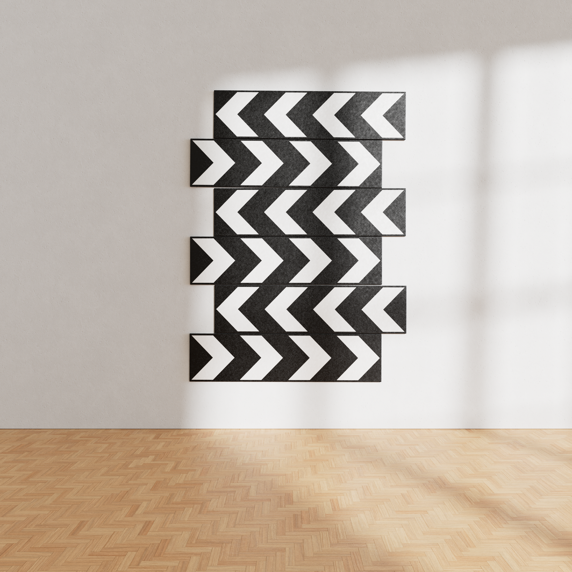 In a standard road environment, these signs are arranged horizontally to guide the driver's eye along a curve. Papi, however, stacks them vertically, dismantling their primary function. This orientational shift triggers a powerful optical effect: the white arrows on a black background lose their nature as directional indicators and merge into a single, tight zigzag pattern. The result is a vibrant kinetic texture that appears to pulsate upon the wall—a rhythmic sequence of sharp angles and high contrasts.